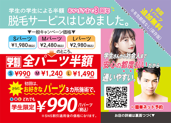 学割SNS会員お好きなパーツ3ケ所で半額キャンペーン